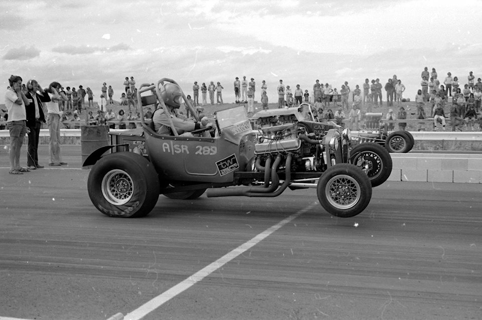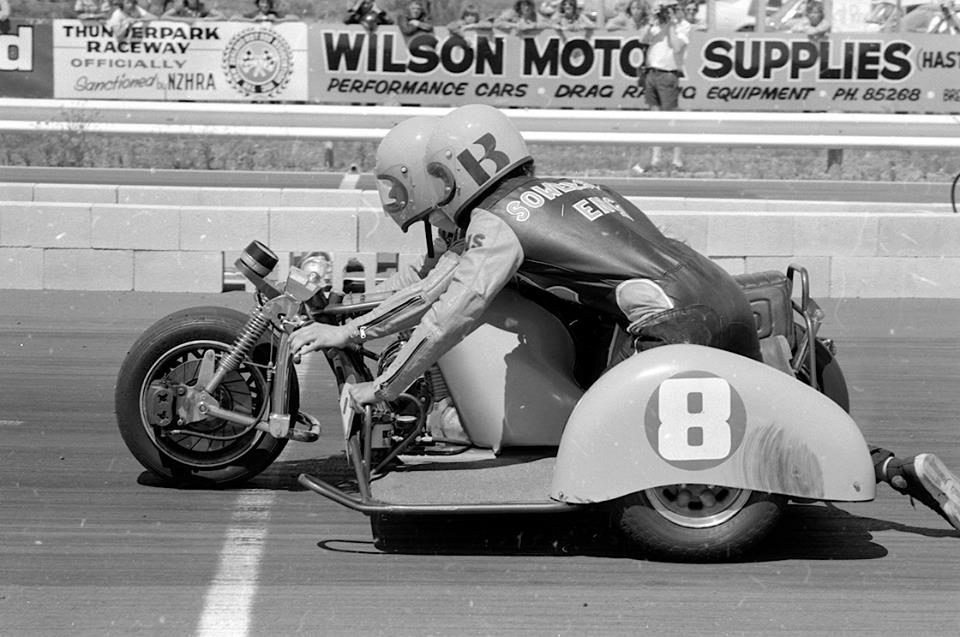 I love this shot. Circuit racing sidecar team gets set to blast down the quarter mile. Would it not have been faster without the swinger?
