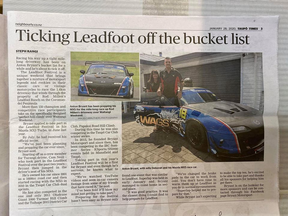 Photos from Bryants own Facebook page - photos as credited and an article from the " Taupo Times ".