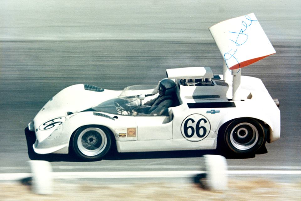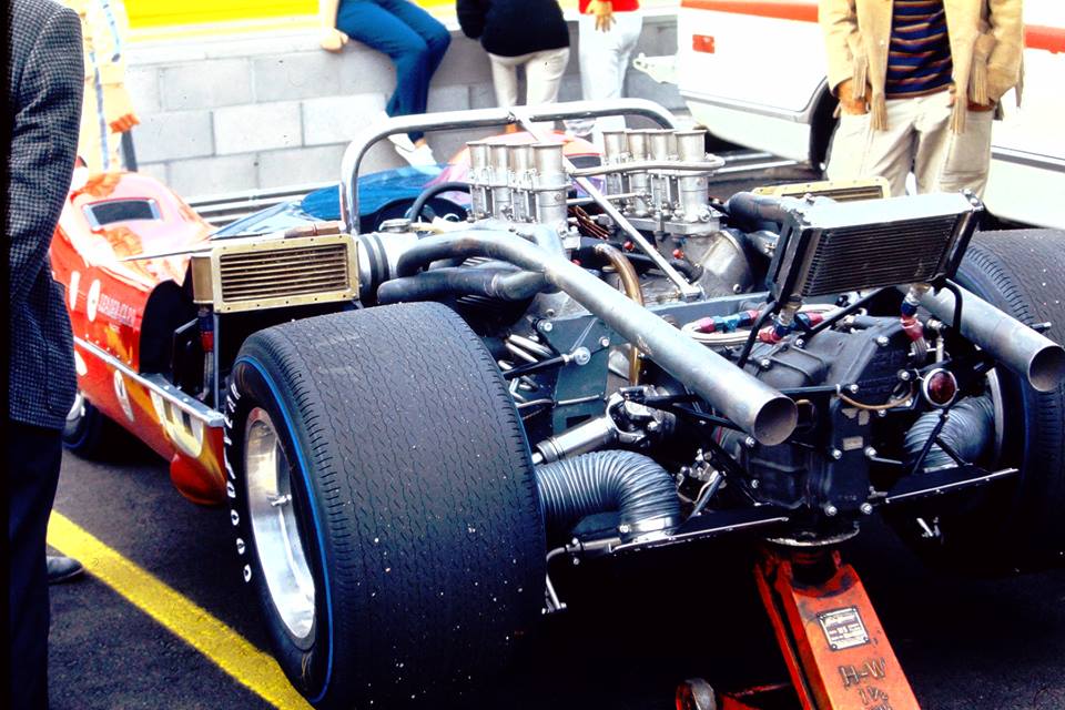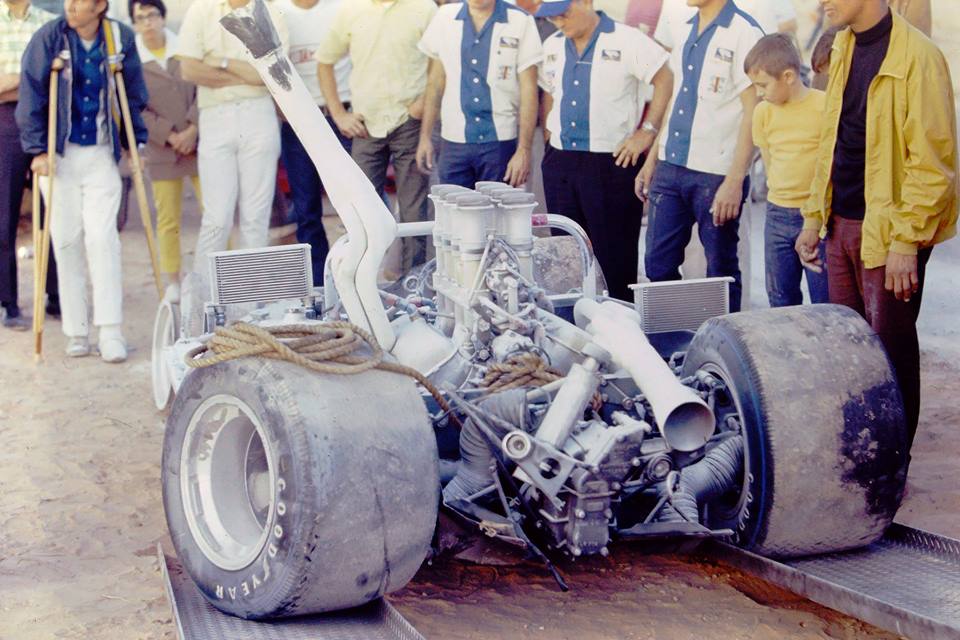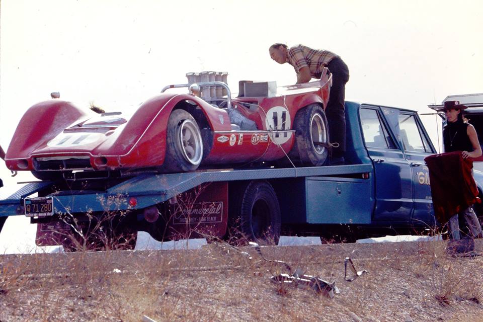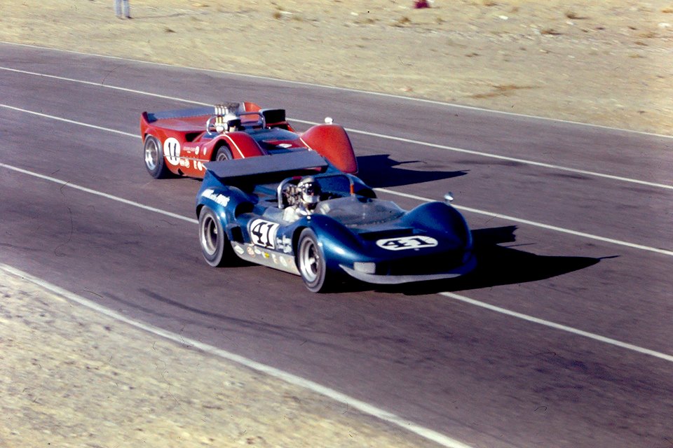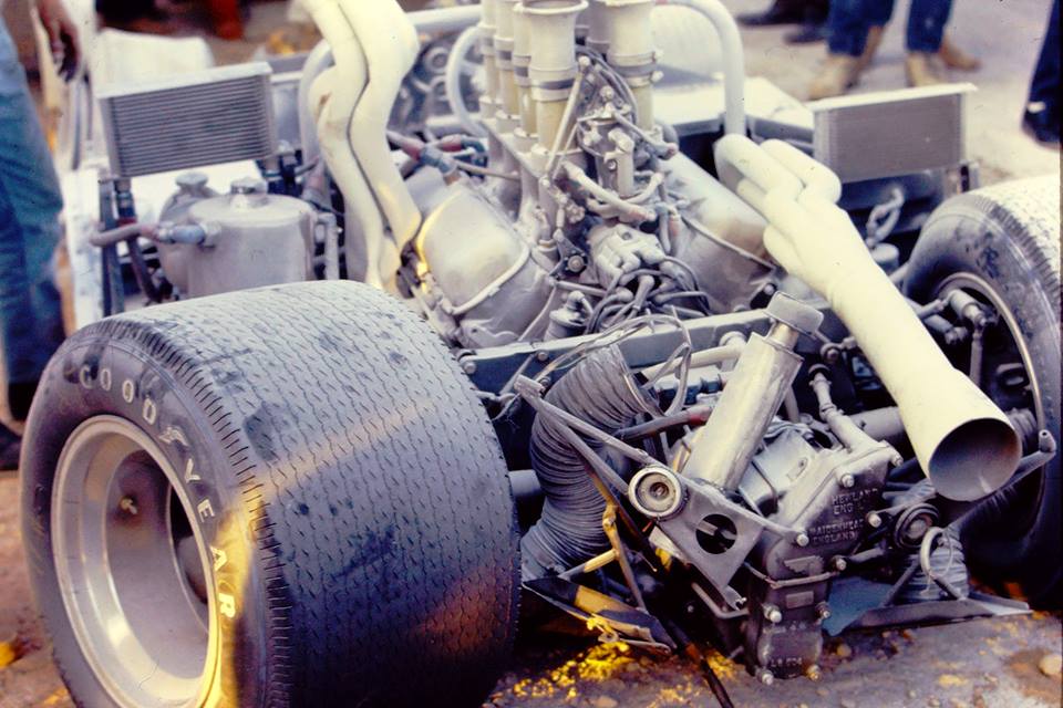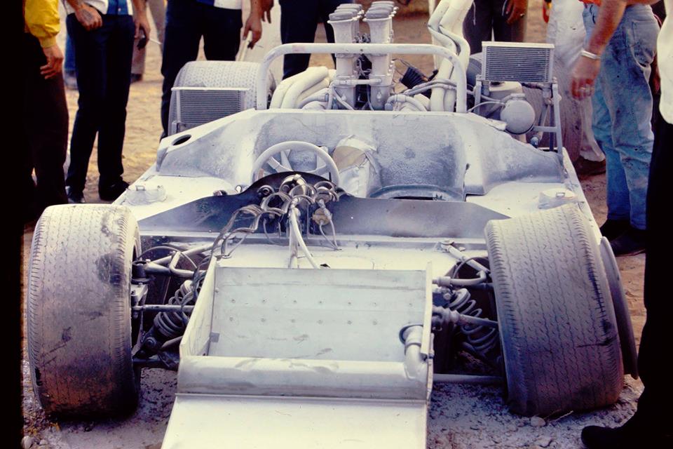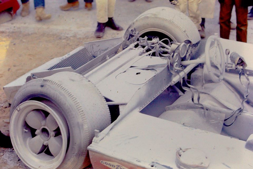 In the final round of the 1968 Can-Am Championship held at Las Vegas, Jim Hall in the Chaparral and Lothar Motchenbacher had the mother of all collisions. It was the result of a series of incidents that began at the first corner on Lap 1, when Mario Andretti and Bruce McLaren touched and both went off the track, with half the field also spearing off into the dust in avoidance. One of those caught up in the carnage was Jim Hall, who visited the pits at the end of the lap to have damaged front bodywork repaired.