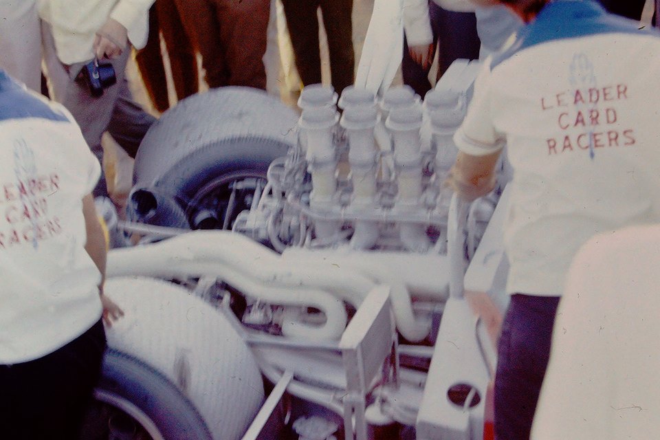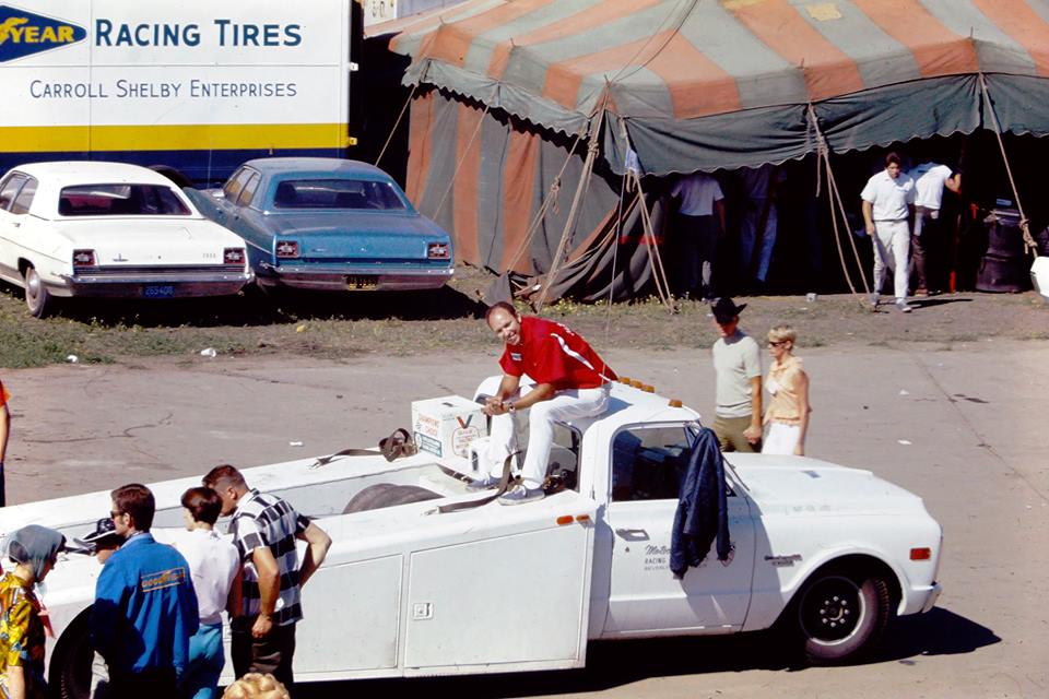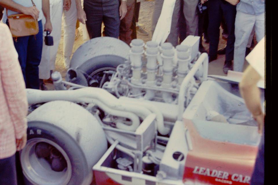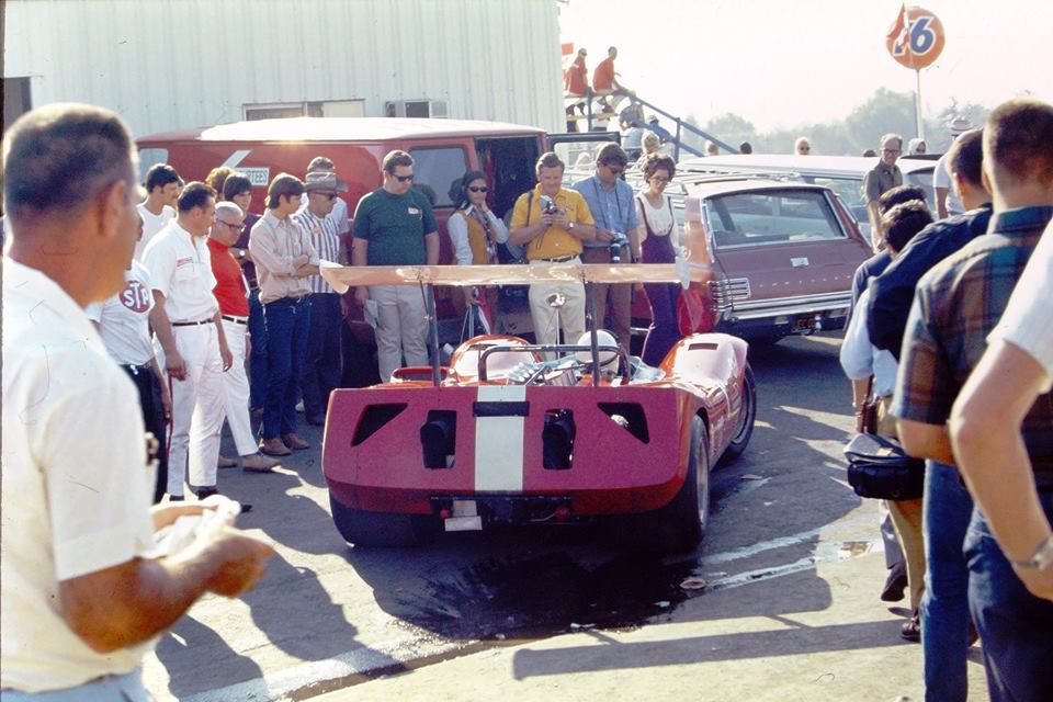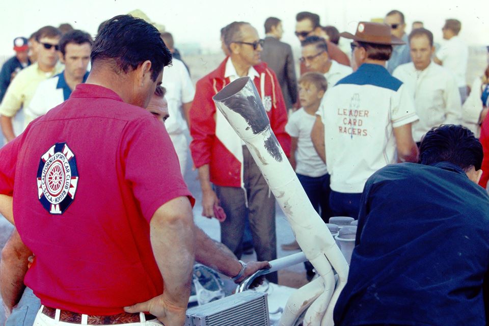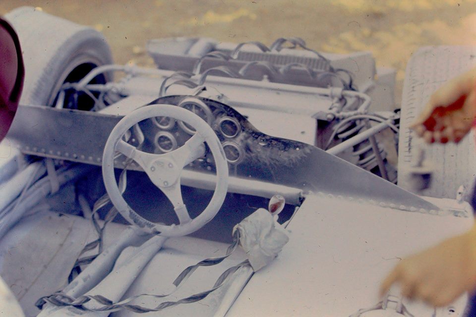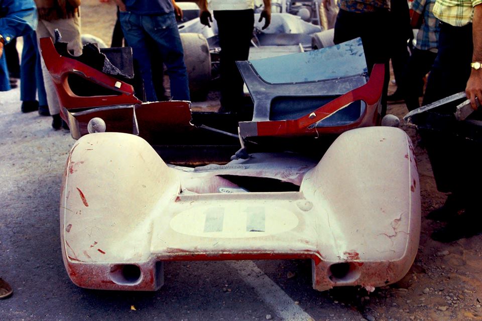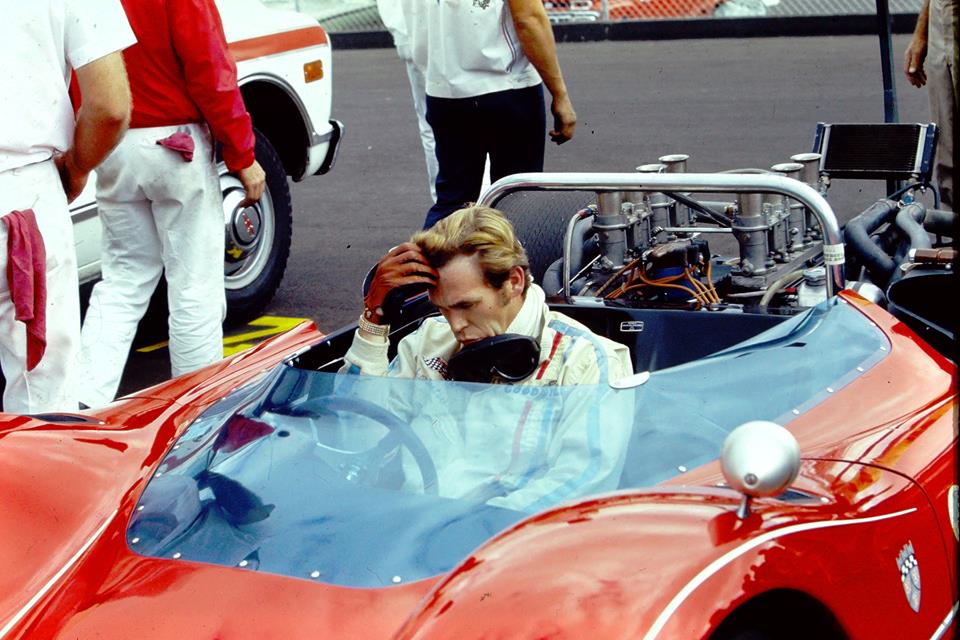In the final round of the 1968 Can-Am Championship held at Las Vegas, Jim Hall in the Chaparral and Lothar Motchenbacher had the mother of all collisions. It was the result of a series of incidents that began at the first corner on Lap 1, when Mario Andretti and Bruce McLaren touched and both went off the track, with half the field also spearing off into the dust in avoidance. One of those caught up in the carnage was Jim Hall, who visited the pits at the end of the lap to have damaged front bodywork repaired.