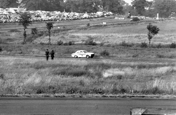 A general view of Oulton Park in 1969 looking from the main straight (in the foreground) to a John Willment Escort exiting the Cascades with the long descent of the Avenue in the background. Noteworthy that the driver is pushing on as the inside front wheel appears to be off the ground.