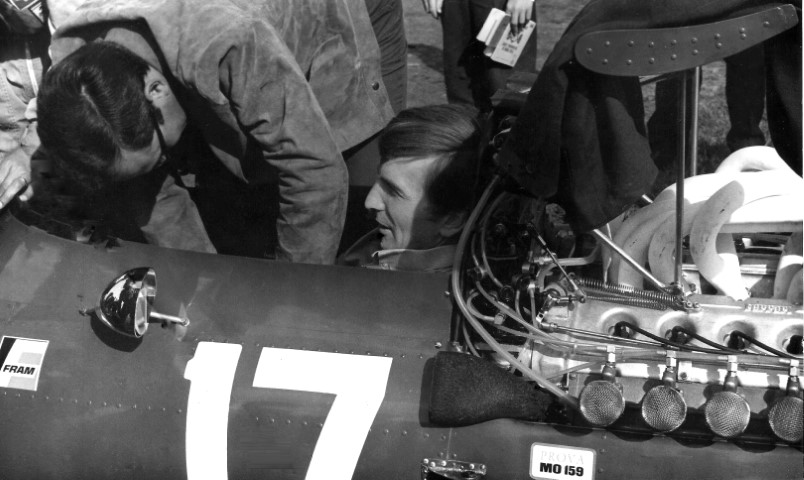 A photograph I took of Derek Bell sitting in his Ferrari 312 at the 1968 Oulton Park Gold Cup meeting. The little decal on the side with PROVA MO 159 on it is interesting. Its basically a form of manufacturers trade plate. PROVA means 'test-driving', while MO is for Modena, the home district of the Ferrari works. The number is the licence number. Theoretically you could test the car on the public roads.