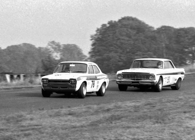 A John Willment Mk1 Escort fending off a Falcon Sprint on the straight leading into Knicker Brook at Oulton Park. A BSCC race in either 1968 or 1969.