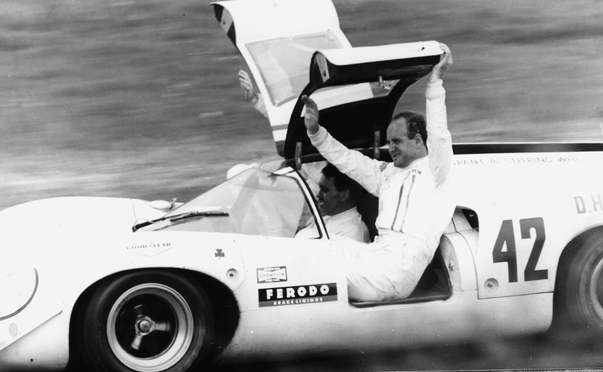 Denny Hulme on a lap of honour in his winning Sid Taylor Racing entered Lola T70 Chevrolet Mk 3 GT, after winning the 1968 Tourist Trophy at Oulton Park. The car is probably being driven by owner Sid Taylor and there is another driver in the hatch on the other side, presumably second placed driver David Piper or his co-driver Richard Attwood.