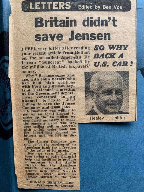 An article -Letter to the Editor from Donald Healey -re The British Government and the De Lorean " adventure ".