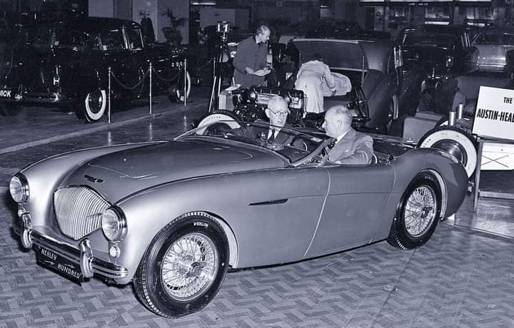 Further photo of the Healey Hundred at the Motor Show with Len Lord and Donald Healey - still with the Healey Badge, but there is an Austin Healey sign behind the Car..
