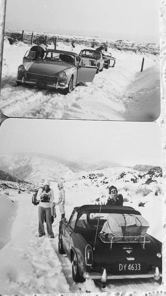 A group of Southern North Island Healeyites in the Central Plateau, on the way home from the Austin Healey Club Annual Rally .. exact year not known but identity of a couple of the Sprites owners is - Jim Reece and the Huynen cars.