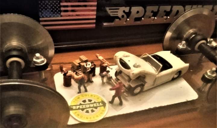 This is an interior shot - complete with " Bug-Eye " Sprite and a Speedwell badge - Tom runs Speedwell in the USA, even today.
