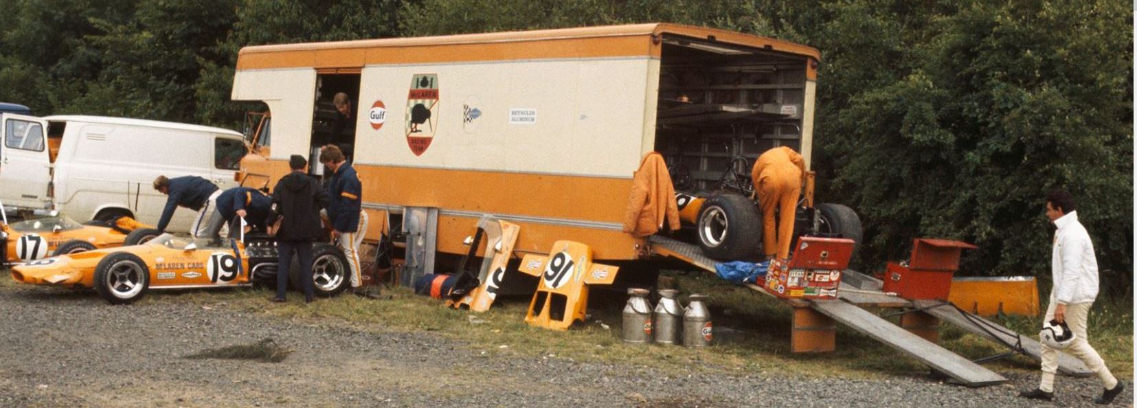 The McLaren Team transporter and crew as they prepare for the race after tragically losing Bruce a month earlier.