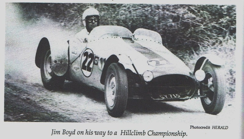 Here is Jim Boyd competing in a Hill Climb; note the narrow wheels compared to the Jim Clark photo but the wider guards to accommodate those widened wheels with the strengthening straps ..