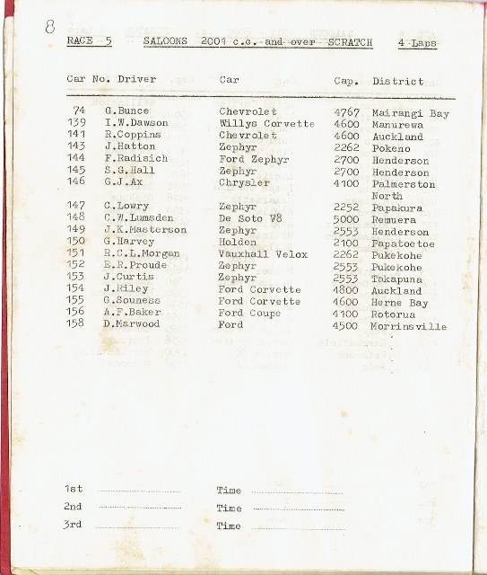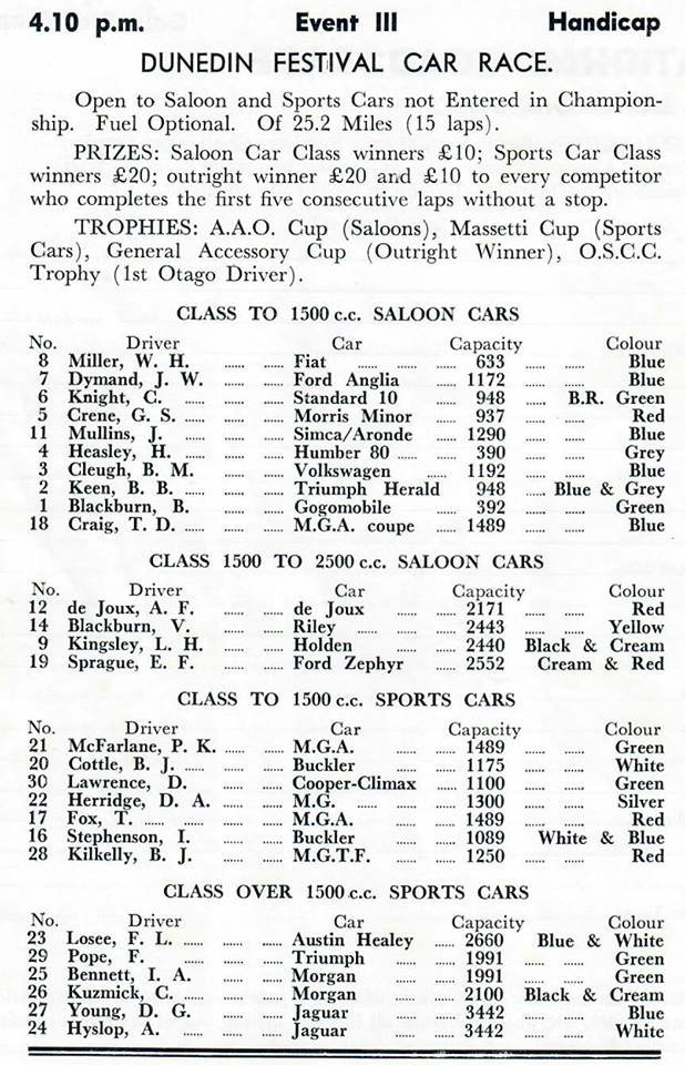 The number 6 Standard 10 is Cliff Knight of Northland (Far North really) he did a tour of every event available for 2 years with that car. Lovely man, rcent years he was running an E type Jag as a "Saloon" at Speedway events (or was it a stock car?) I note with interest, every saloon that completes 5 laps gets half what the winner does. That's a great gesture, and £10 back then was quite a bit of money!