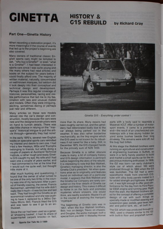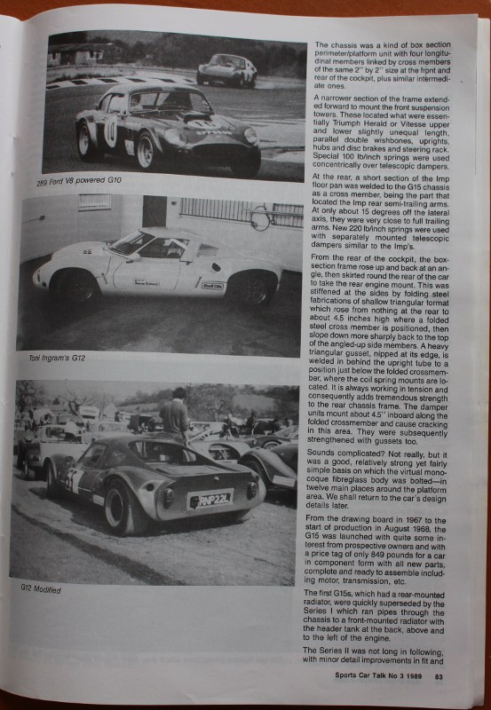 The car photos appeared in an article in " Sports Car Talk " magazine issue #3 in 1989 written by Richard Gray who was detailing the restoration of a Ginetta G15 a well known NZ car with Rego HL7470 now G15, the car fully restored and remains in new Zealand.