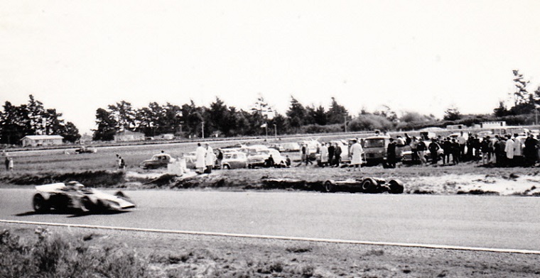 Graham McRae in the Begg FM2 passes the scene where poor Barry Thomasen had had his accident in the Brabham-Climax.