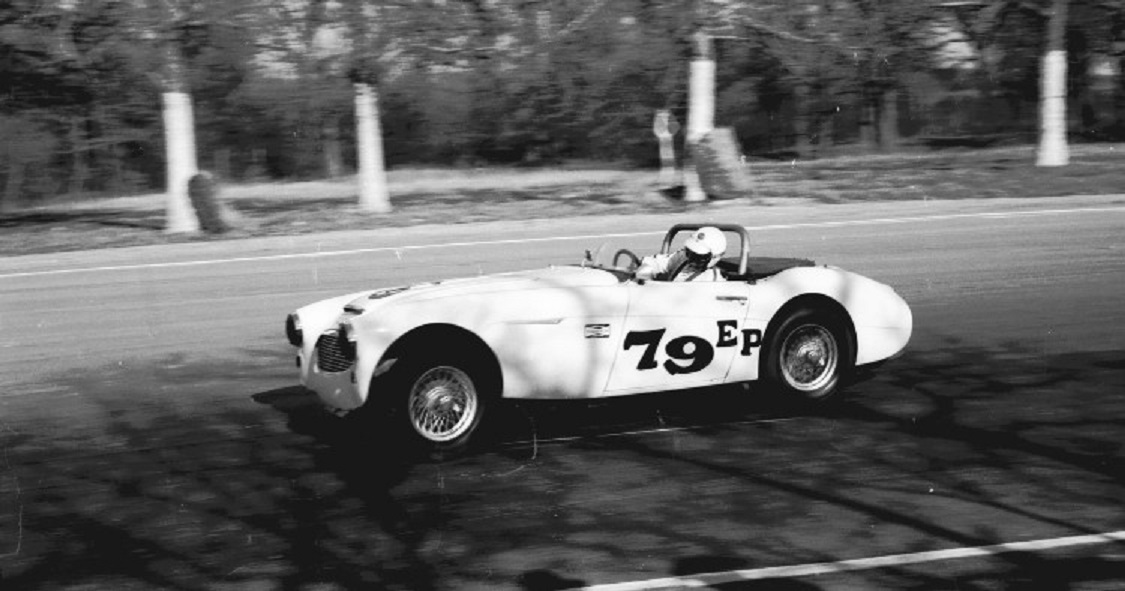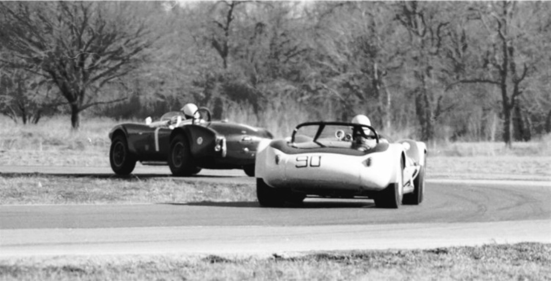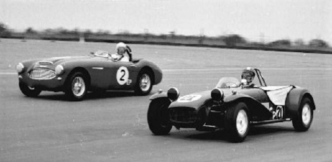 Jimmy Johnson in his Austin Healey # 2 looks surprised as Jim Kaufman passes on the inside in his Lotus Super 7 # 21.