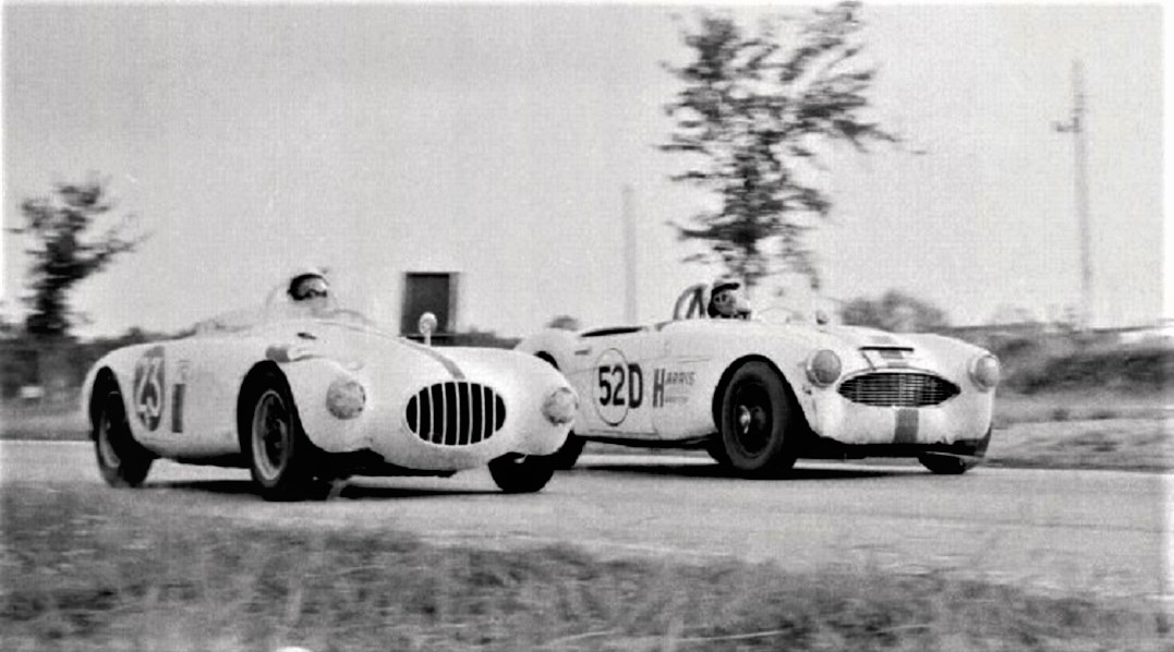 Austin Healey # 52, battling with an OSCA sports car # 23