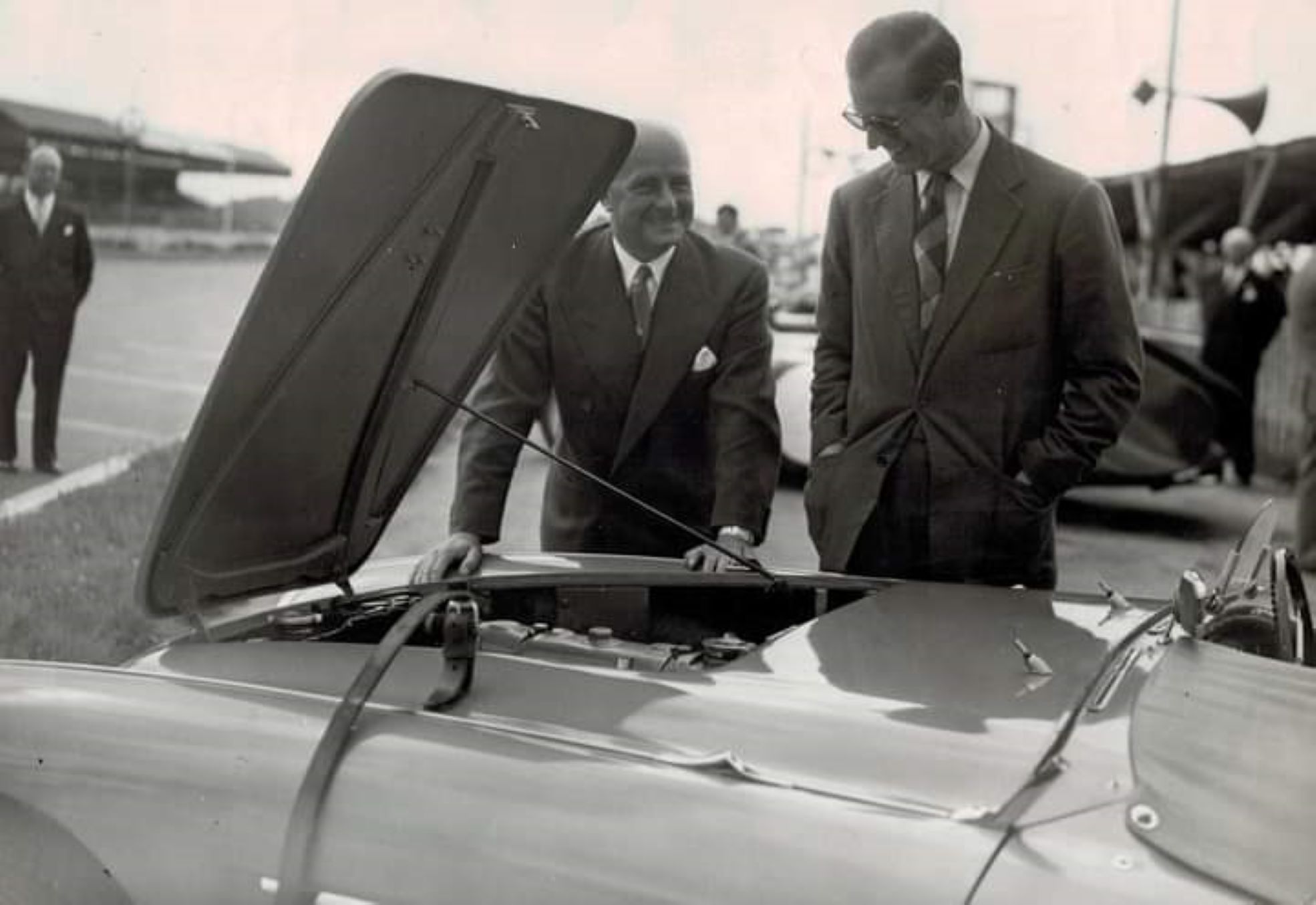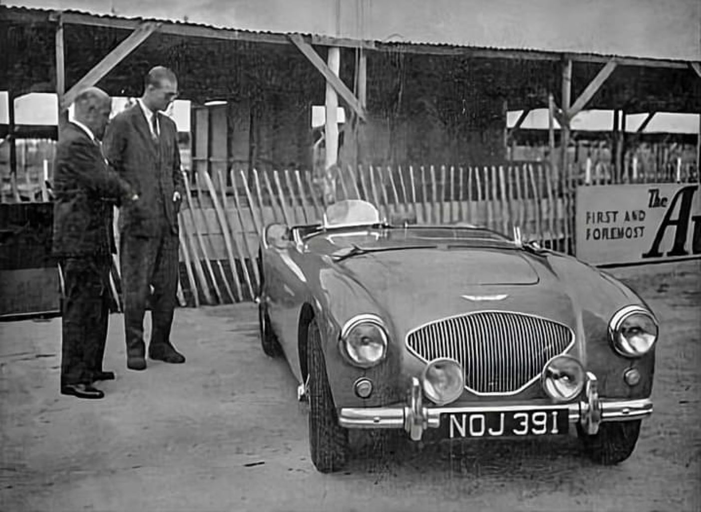 Donald Healey [ DMH ] showing The Duke of Edinburgh [ HRH ] the car NOJ391.