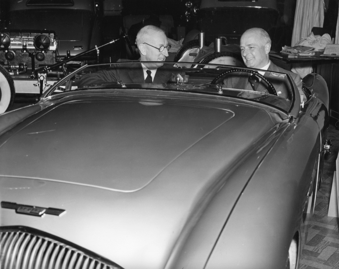 Leonard Lord with Donald Healey in the car - " Healey 100 " badge on the car - first day of the Motor Show.