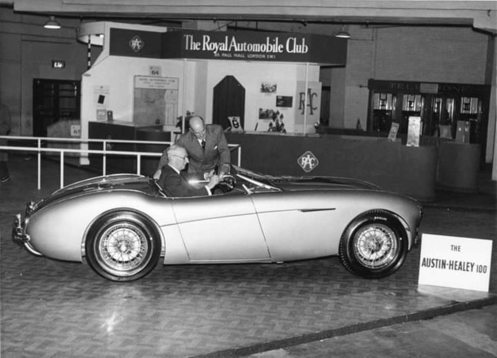 Another photo of the pair in the car - can't see the badge but it is after the agreement was signed and the car became the " Austin Healey 100 ". the sign beside the car states that ..