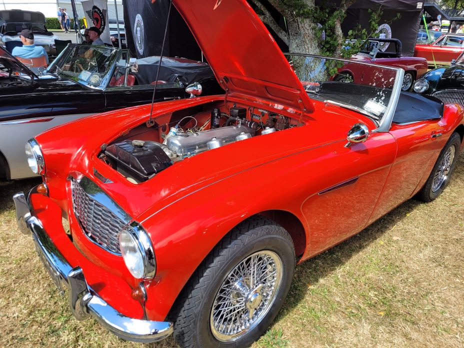 Plate partly hidden - actual Plate is MY1008 and is car known as the 100 Eight [ 100/8 ] in the Austin Healey Club since the 1970's when it was first rebuilt with a V8 by Reg Whittaker, he still owns it and it went to the Concours' with BMC BOY Ross Cammick and the Red wire wheeled early 3000 in the photos.