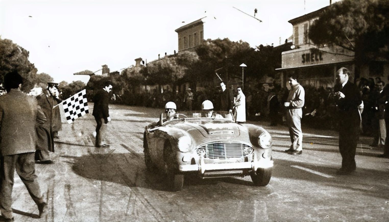 The cars first event was the 1957 Mille Miglia, where it appeared with a cut down windscreen - seen here at Scrutineering with Co Driver Cecil Winby - photo by George Phillips for Autosport Magazine taken at Brescia 1957.