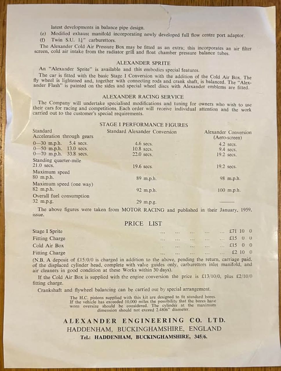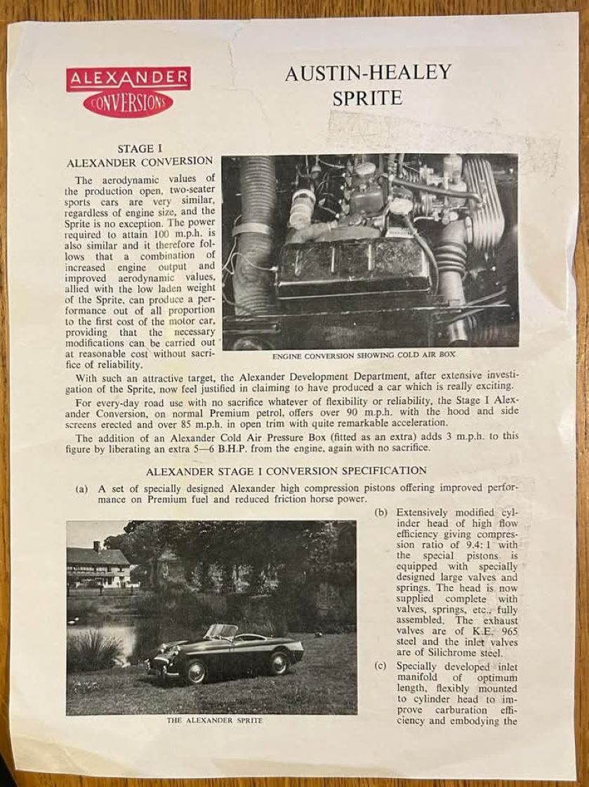 They produced Engine modification kits for the Austin Healey Sprite and were known as " Alexander Conversions ".