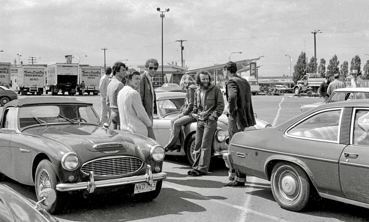 Donald Healey among some people no AH cars at a " West Coast Meet " - noted as being at Eugene Oregon by photographer Brian Coulter