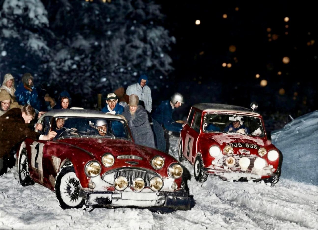 BMC Works Rally Team Austin Healey 3000 with BMC Mini Cooper S - on a Rally - Monte Carlo ? - [ to be checked out ] in the snow - Colour image. BMC archives - photog not known.