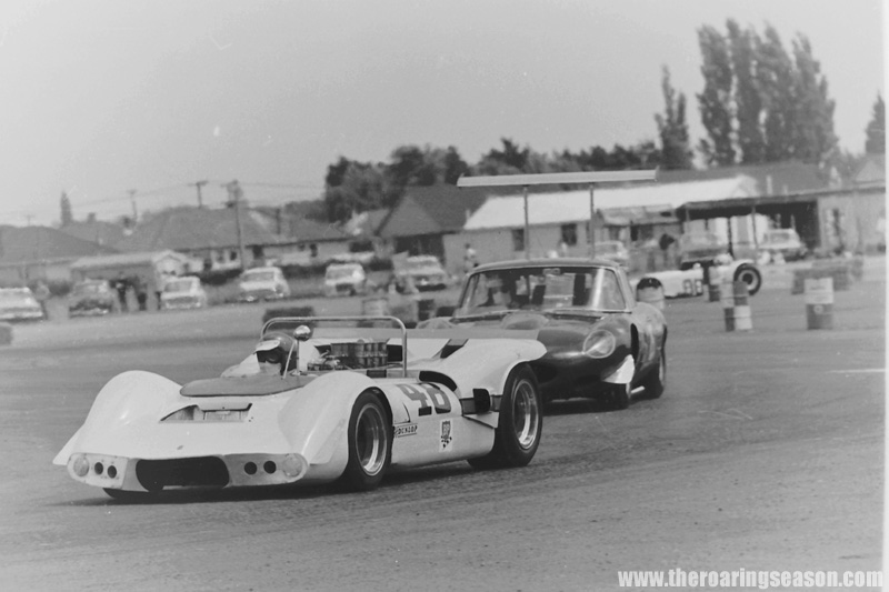 Sports car action at Wigram, as Grahame Harvey in the Elfin leads Scott Wiseman in the high-wing E Type.
