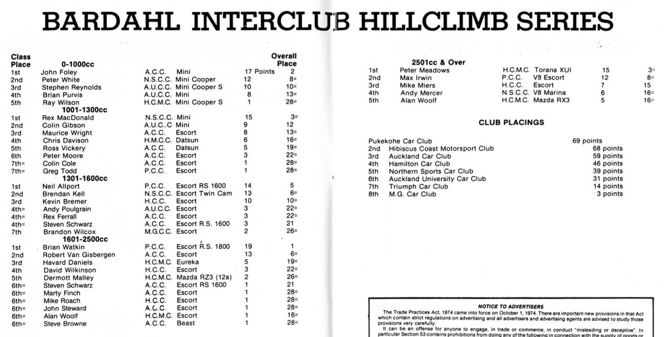 The Bardahl series Hill Climbs were run by 8 different Car Clubs in the Auckland Frankton Waikato area over the
