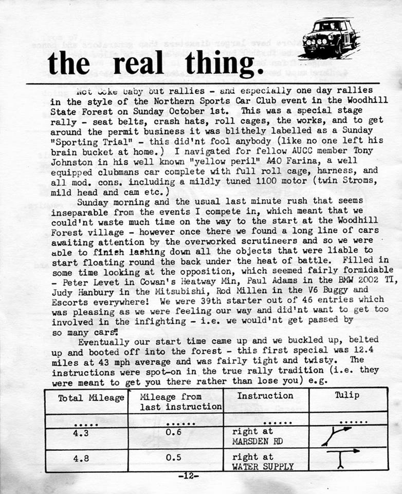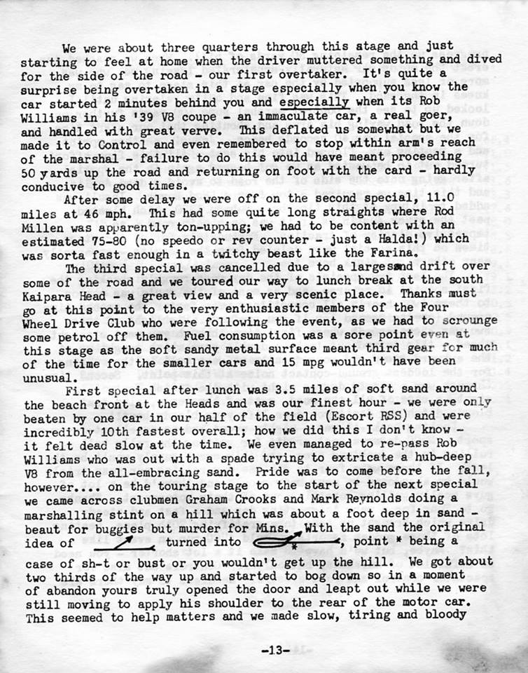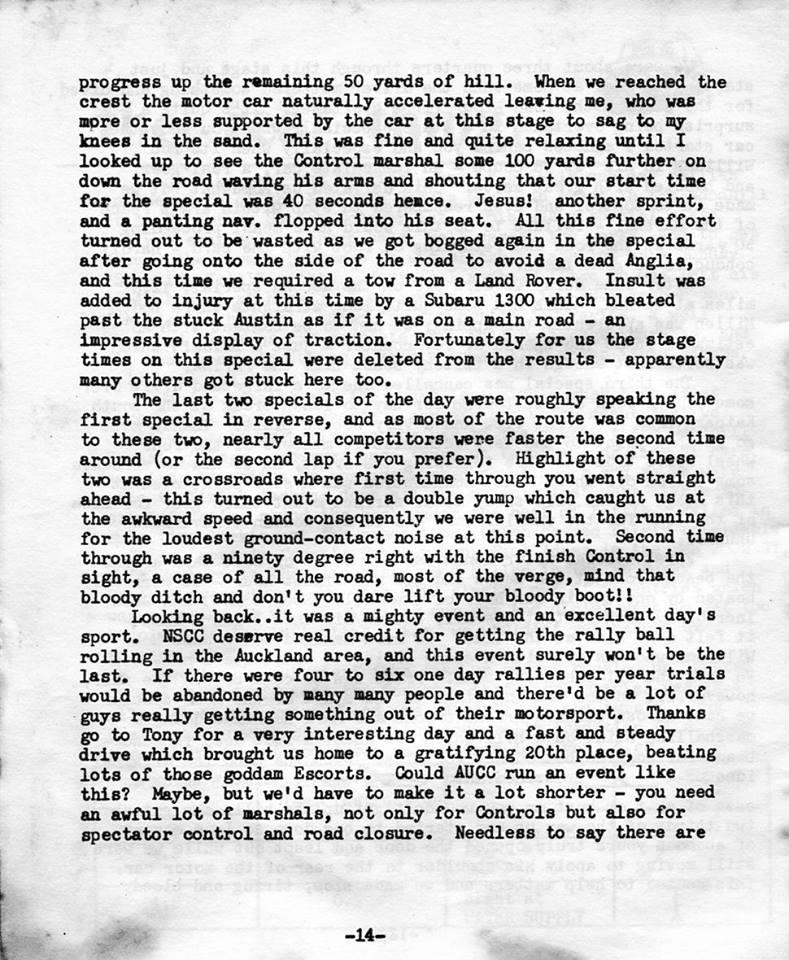 Milan Fistonic has posted an article that appeared in the " Auckland University Car Club " magazine - written by Allan Grout. there is a comment that it was called a Sporting Trial, as clubs were testing the Rally Rules. I do remember Rod Peat suggesting that I enter in my 850cc standard Mini, as Roll Cages and Full Harness seat belts were not yet required. I didn't enter but went to help as a Marshall, which meant you did get to drive on some of the roads.