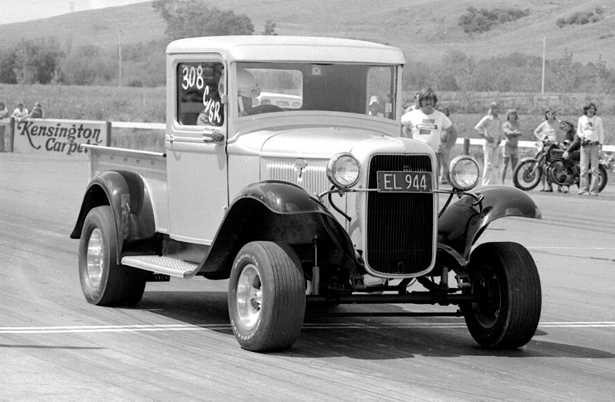Now..... Allan Porter wasn't sure on the details of this car and driver. However, a facebook post by Bryan Thomas went as such: "Aztec Fibreglass, Laurie Larsen, Hamilton feller..327 with Smokey Yunick single 4 inlet manifold...Flathead gearbox...Tow truck would have been a 39/40 Ford pickup..Green color mebbe....Chassis was the old Larry Fergusson rail".