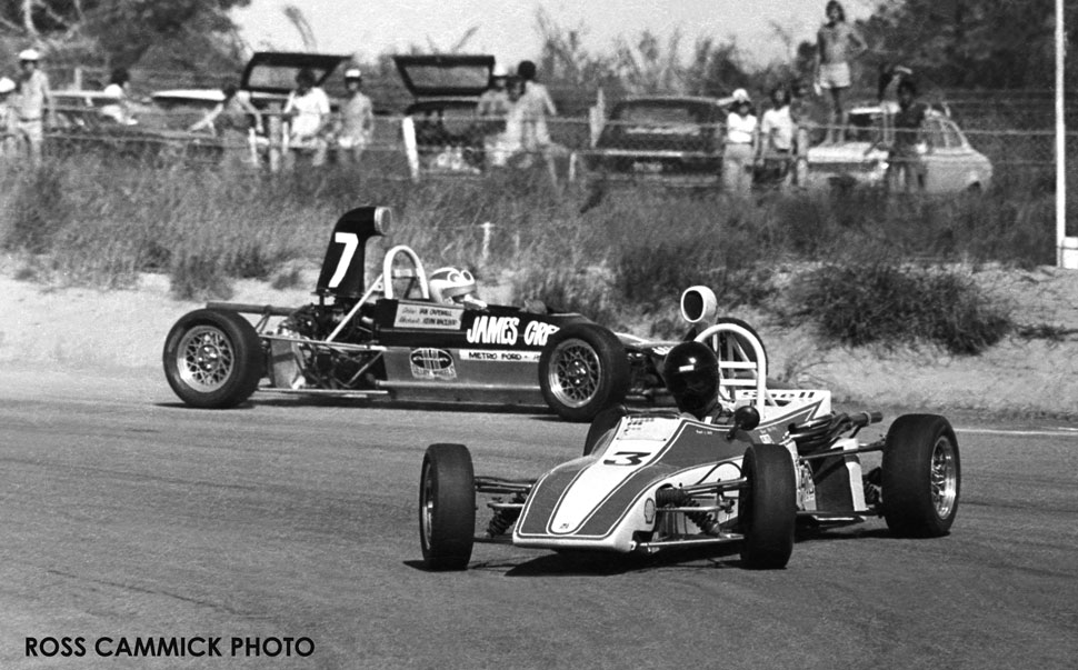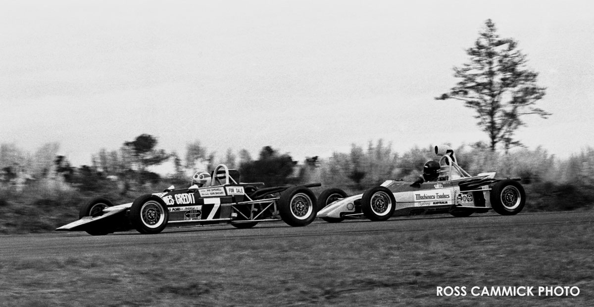 Bill Leckie in his Chev F5000 Capri in its early guise, from the 1976 season. This car was built to contest the 4.2 litre championship, but would eventually get fast enough to compete for outright race wins. Looks like Rex Hart just ahead.