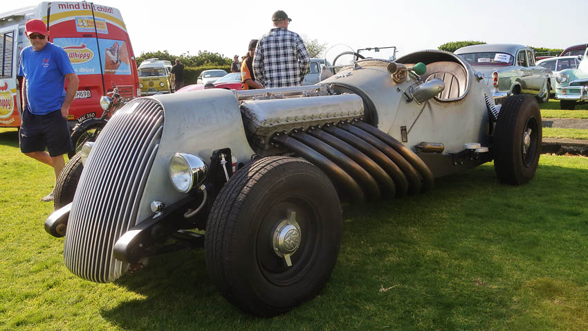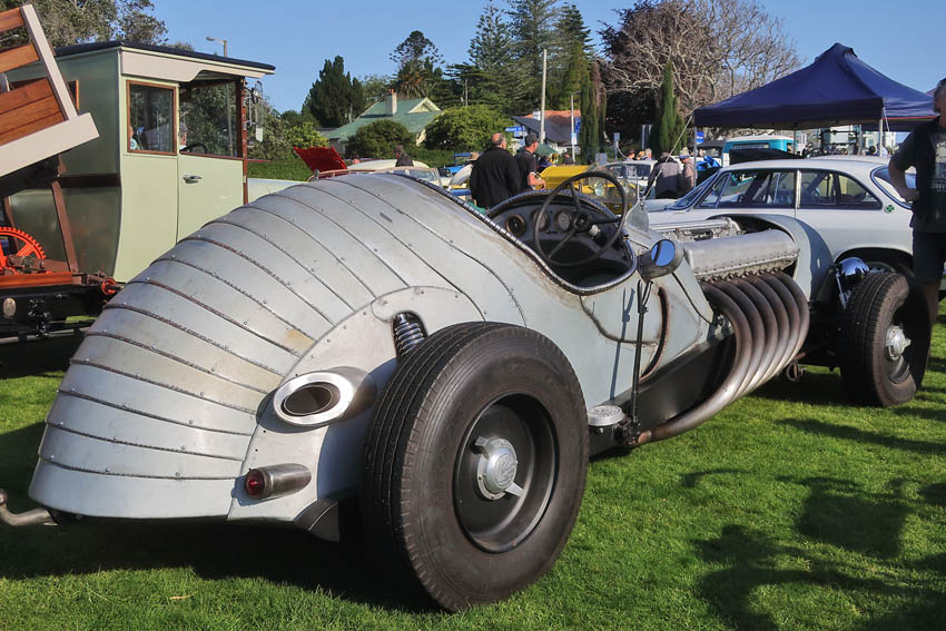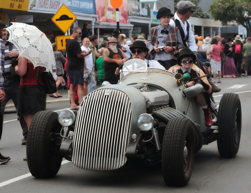 Fully laden RR Merlin V12 powered single seater rumbles down Thames main street at the Steampunk Festival. I was quite amazed at how quiet it was, but then it was only idling.