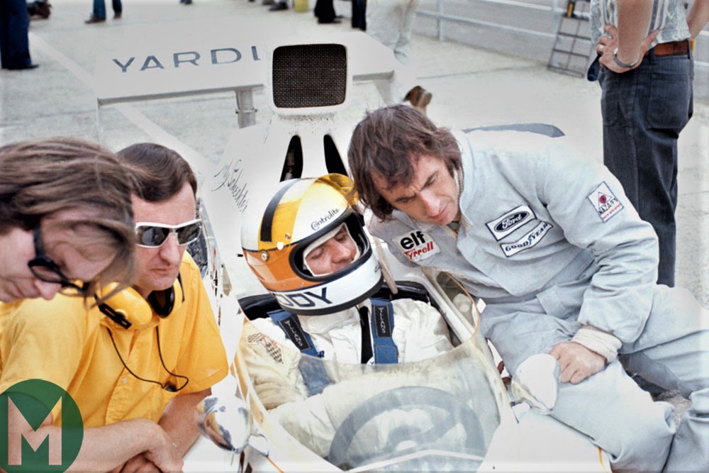 Practice day at Silverstone. 1973. Phil Kerr,(L) Jody Scheckter getting suggestions from Jackie Stewart.