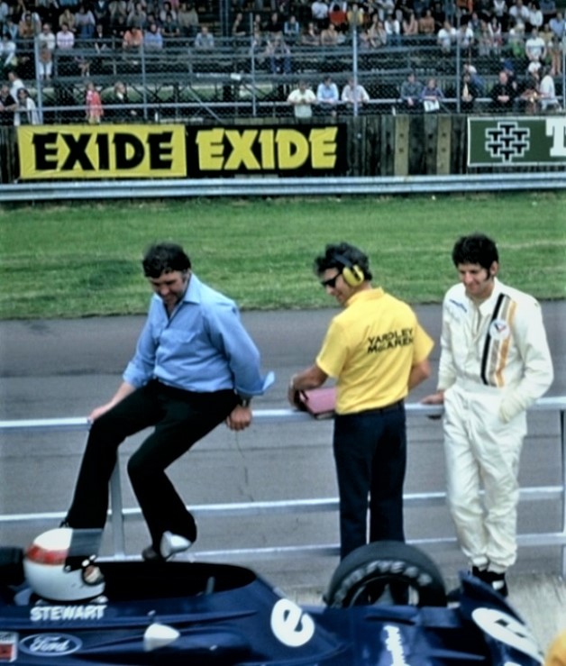 Sid Taylor (L) and Jody Scheckter(R) watch Jackie Stewart drive into the Silverstone pits. July 1973.