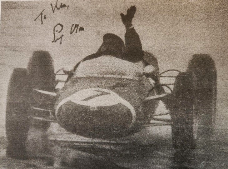 Example of Stirling Moss autograph in my scrapbook, of winning drive at Ardmore January 1962. NZGP. In the rain.