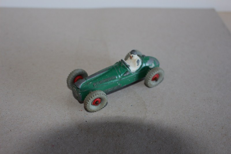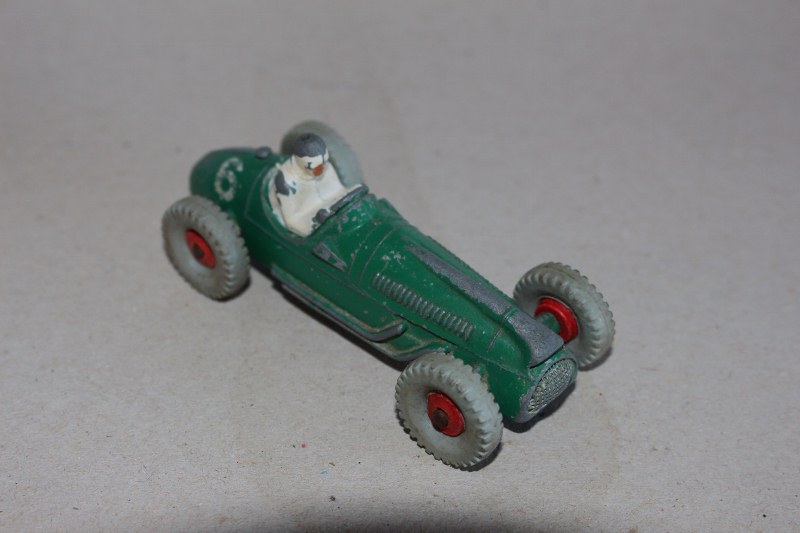 The car is from the 1955 Dinky release, the tyres - period correct are from the 1990's - purchased from a Model Shop that was in Birkenhead, near ERC's place. A racing car with Nobbly tyres ..
