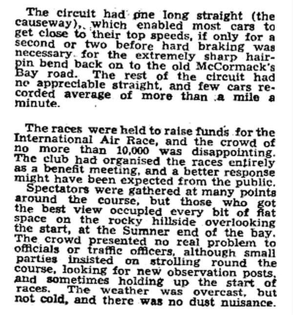 The Roads are still there - the Main Straight was the " New " Causeway and the rest of the track the Original MCormacks Bay Road, around what is by then a Lagoon, so it was a Triangular shaped Track.