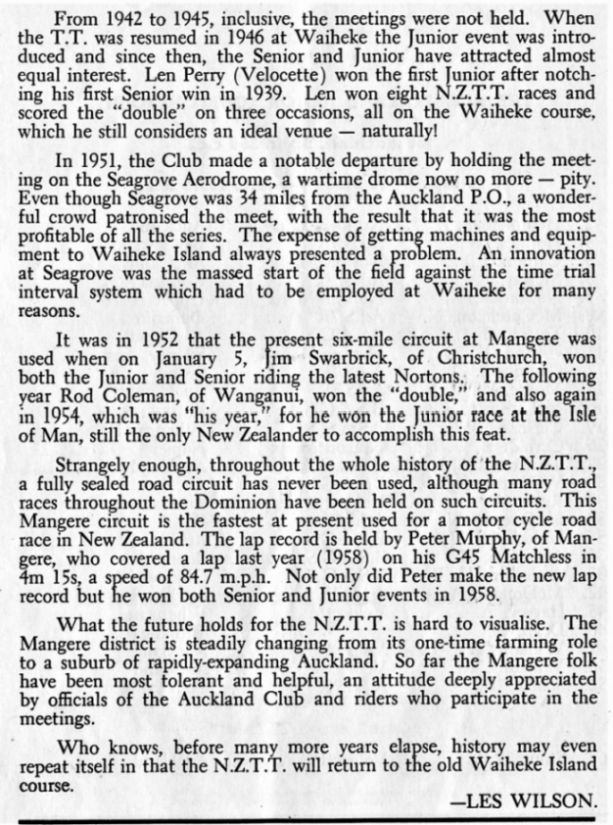 Waiheke was used from 1931 to 1950 [ a break from 1941 until 1946 because of the War ] and after 1950 went onto the Mainland, at Seagrove, a circuit at Mangere and later Pukekohe.