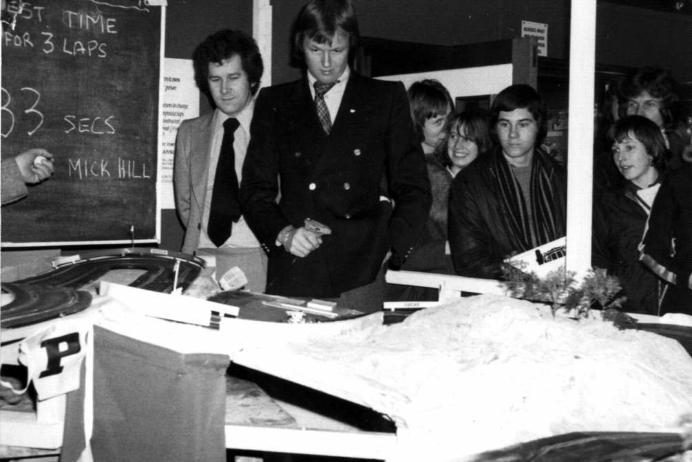 I built this Scalextric version of Donington, a year before it opened (I won't tell you what Tom Wheatcroft thought of my building abilities, but when I said it would at least be operational before his, he walked away laughing his head off!). We had a stand at their 1976 Racing Car Show, in conjunction with Donington Park as we knew that we would be the first car club to run an event at the rebuilt track. As you can see from the pic, Ronnie Petersen had a go, but local Super Saloon driver Mick Hill, held the record at that time.
