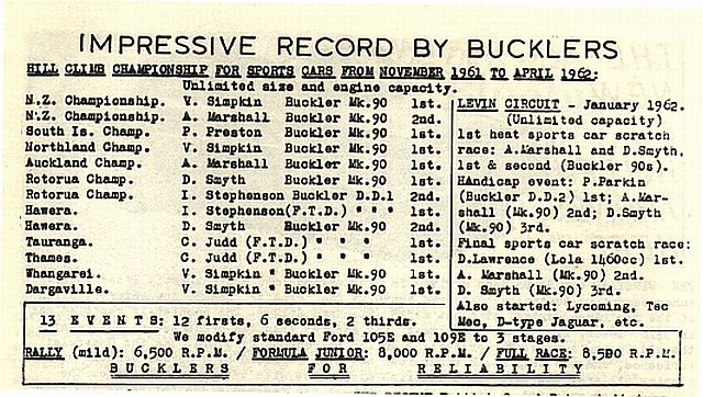 Buckler is actually very specific. It has nothing whatever to do with body styles, although the archetypal NZ Buckler 90 is clad most times with a de Joux fibreglass body. These bodies also appear on a number of other cars which are not Bucklers. In the day it was very desirable to call your Ford 10 special a Buckler, possibly like calling your Falcon GT an HO.