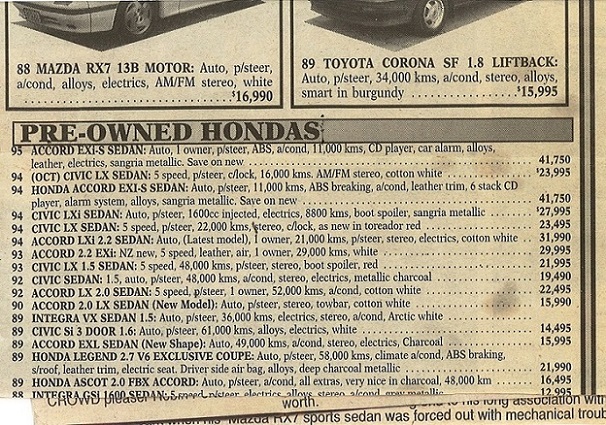 If only I had a crystal ball ! Here are some Honda prices in April 1995. I could have spent $ 30,000 to buy a decent car that would not be worth much today. Apple stock at that time was about $ 5.00 per share. If I had brought 6000 shares then instead of the Honda they would have been worth about $ 4.5 million US today @ approx. $ 800.00 each before splitting etc..! I did neither, I just dream ..what if !
