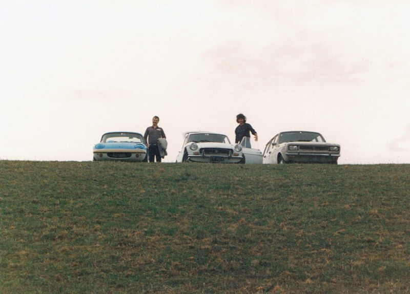 Spectator cars Richard Leaper by the Lotus [ his ] Lyle Chambers by the MGB, [ Richard's mothers ] and a Hillman Hunter wagon for support.