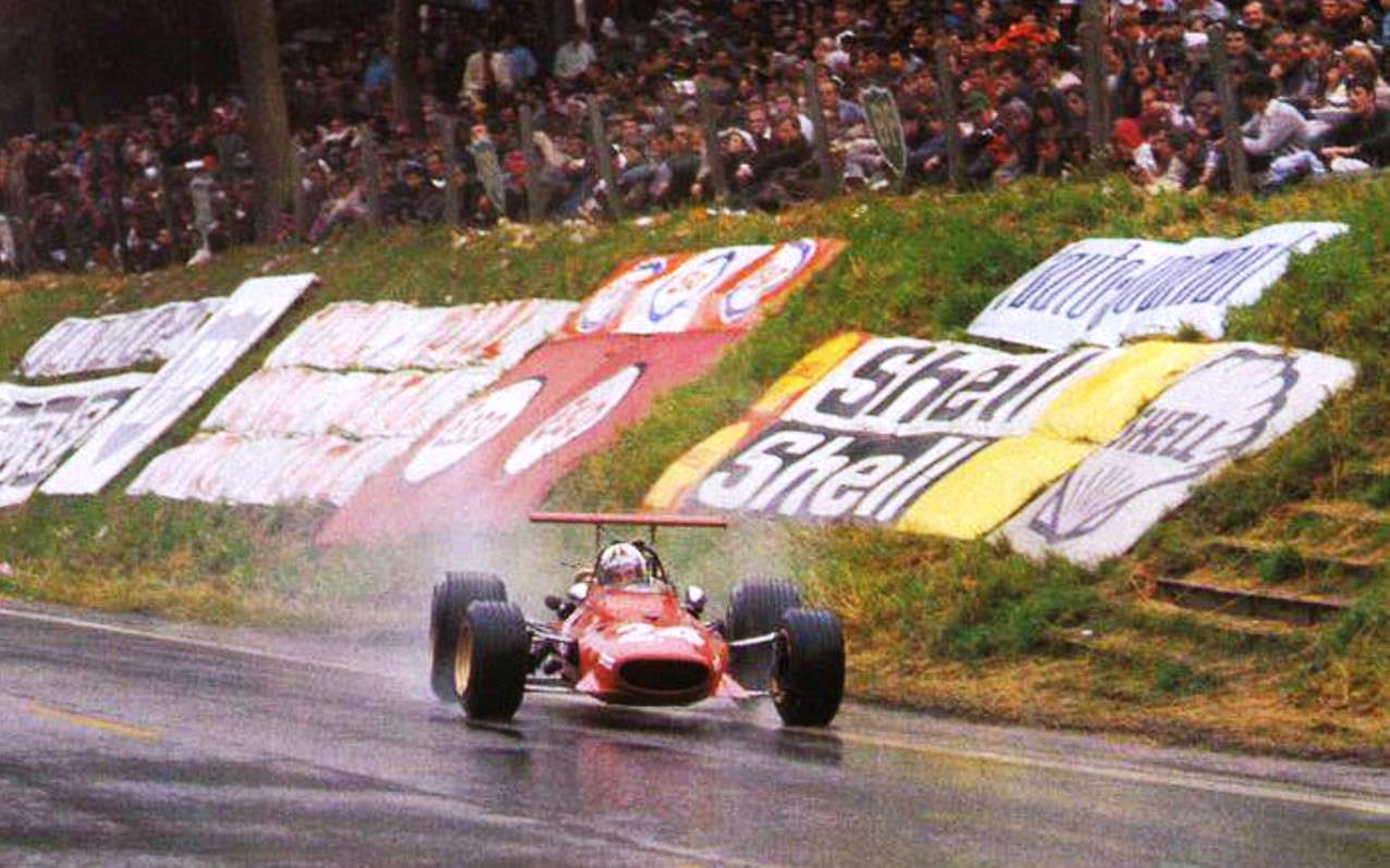 A master at work using ALL of the track in the rain at Rouen in 1968.