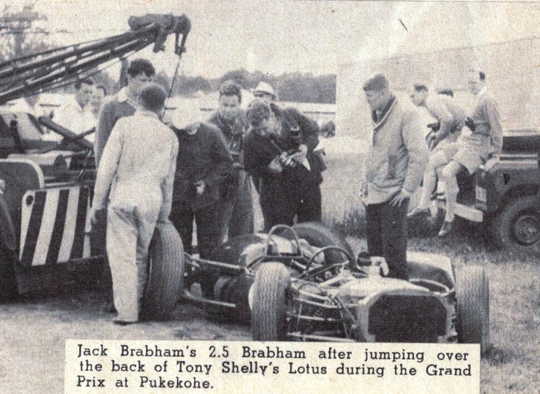Bruce McLaren slowed down in his Cooper T70 long enough to check on Brabham and Tony Shelly and then drove off to win the 1964 NZGP.