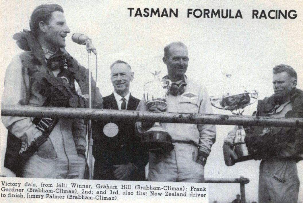 Well deserved winners on the victory platform. NZGP winners. Jan. 11th 1964.