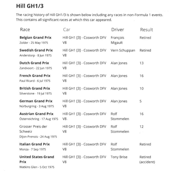 The Hill GH 1 /3 was raced by several drivers throughout the 1975 F1 season.